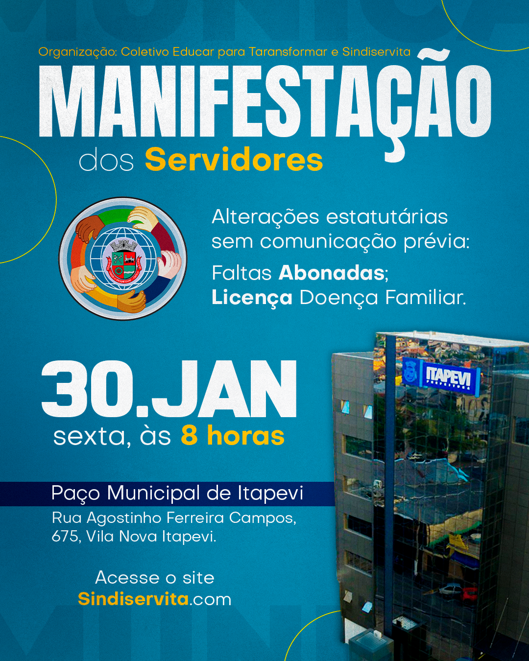 Nesta sexta, dia 30 de janeiro, às 8 horas, todos os Servidores estão convocados para uma manifestação em frente ao Paço Municipal. É hora de mostrar nossa força, exigir diálogo e lutar por nossos direitos. Não podemos aceitar decisões impostas sem negociação! Leve seu cartaz, sua voz e sua indignação. Somos nós por nós mesmos – e juntos, seremos ouvidos!
