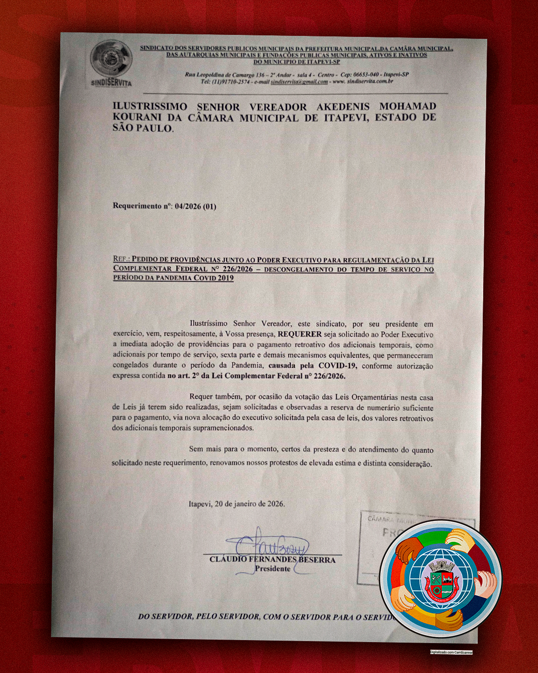 Paralelamente, o Sindicato acompanha as tratativas internas da Câmara para que seus próprios Servidores também tenham seus retroativos quitados e benefícios atualizados ainda em 2026.