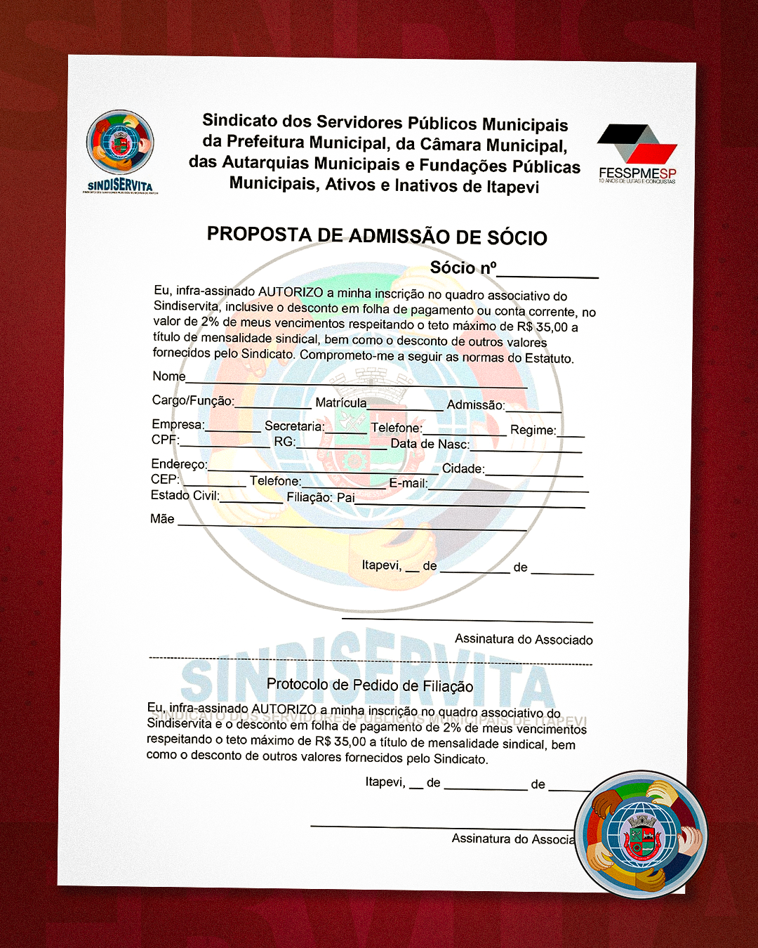 Funcionamos de segunda a sexta, das 8 às 17 horas. WhatsApp (11) 91710.2574. E-mail: sindiservita@gmail.com – Estamos na rua Leopoldina de Camargo, 136, salas 3 e 4, Centro. CEP 06653-040. Para facilitar seu processo de filiação, preencha a ficha abaixo e mande por e-mail que entraremos em contato. O desconto nos vencimentos é de 2% e limitado a R$ 35,00 ao mês.