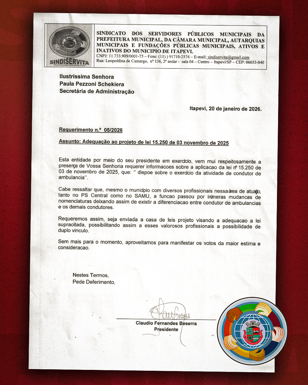 O Sindiservita, representado pelo presidente Claudio Fernandes Beserra , protocolou no dia 20 de janeiro de 2026 o Requerimento nº 05/2026. O documento, destinado à Secretária de Administração Paula Pezzoni Schekiera , solicita a adequação do município à Lei nº 15.250 de 2025, que regulamenta a atividade de condutor de ambulância.